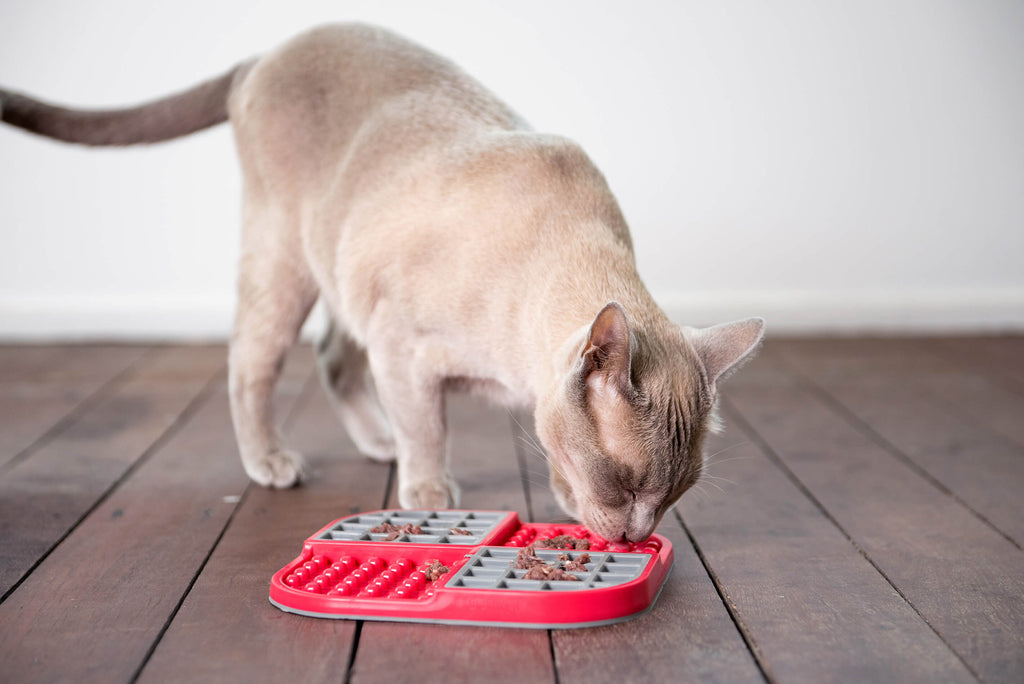 Pros: The mat works very well with pets that are very food motivated like mine. Momo snarfs down his food even with a regular slow feeder. The waffle shaped compartments really help in slowing down the gobbling. It also provides a fair entertaining brain exercise for him since he has to work out how to get the kibbles out. There is a silicone base rim that helps with some slipping and sliding if your pet pushes the feeder around when they get too excited. It's not ceramic or glass so no worries about breaking if you drop it or if your pet gets a little rough with it. Cons: Not the easiest to wash and dry due to the waffle indentations. I would recommend using a used toothbrush to get into the nooks and crannies. Leave it out to dry on a rack instead of wiping it dry with a tea towel or cloth. It's definitely easier.