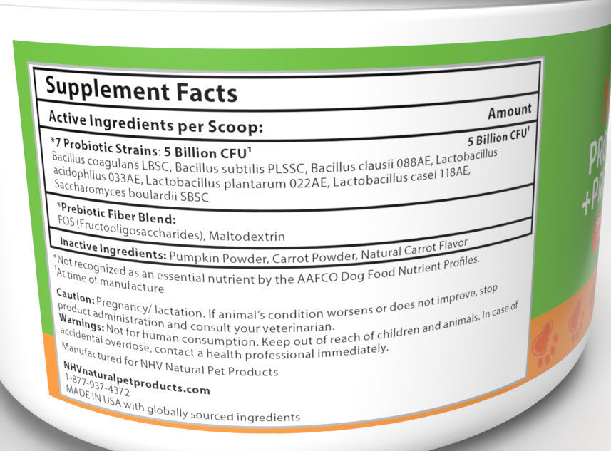 NHV Probiotics + Prebiotics for pets help maintain balance and support a healthy GI tract in your little one. It comprises of 7 strains of high-quality probiotics, with each scoop containing 5 Billion CFU (Colony Forming Units - the active good bacteria).